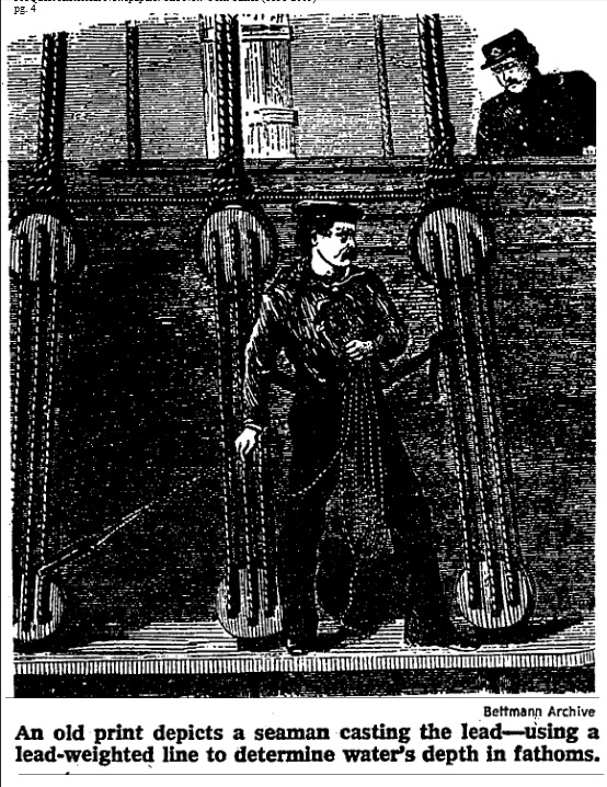 A scientist today may insist that she cannot fathom approaching scientific research in the style of the 1800s, and in saying so, hit upon one of the very concepts used in early science and seafaring. The fathom is a unit of measurement believed to have been used in some fashion by many early seafaring cultures. To measure the depth of the ocean, sailors would feed a weighted line known as a lead line over the side of the ship until it hit the seafloor and slackened. As he pulled in the line, a sailor would measure it between his outstretched arms to keep track of the amount of line retrieved and, therefore, the depth of the water. This process is known as taking a sounding. Fittingly, “fathom” is derived from the Old English word “fæthm,” meaning outstretched arms. The length of rope that reached across a sailor’s extended arms was equal to one fathom. Sometime during the twelfth century, one fathom was officially defined as six feet.