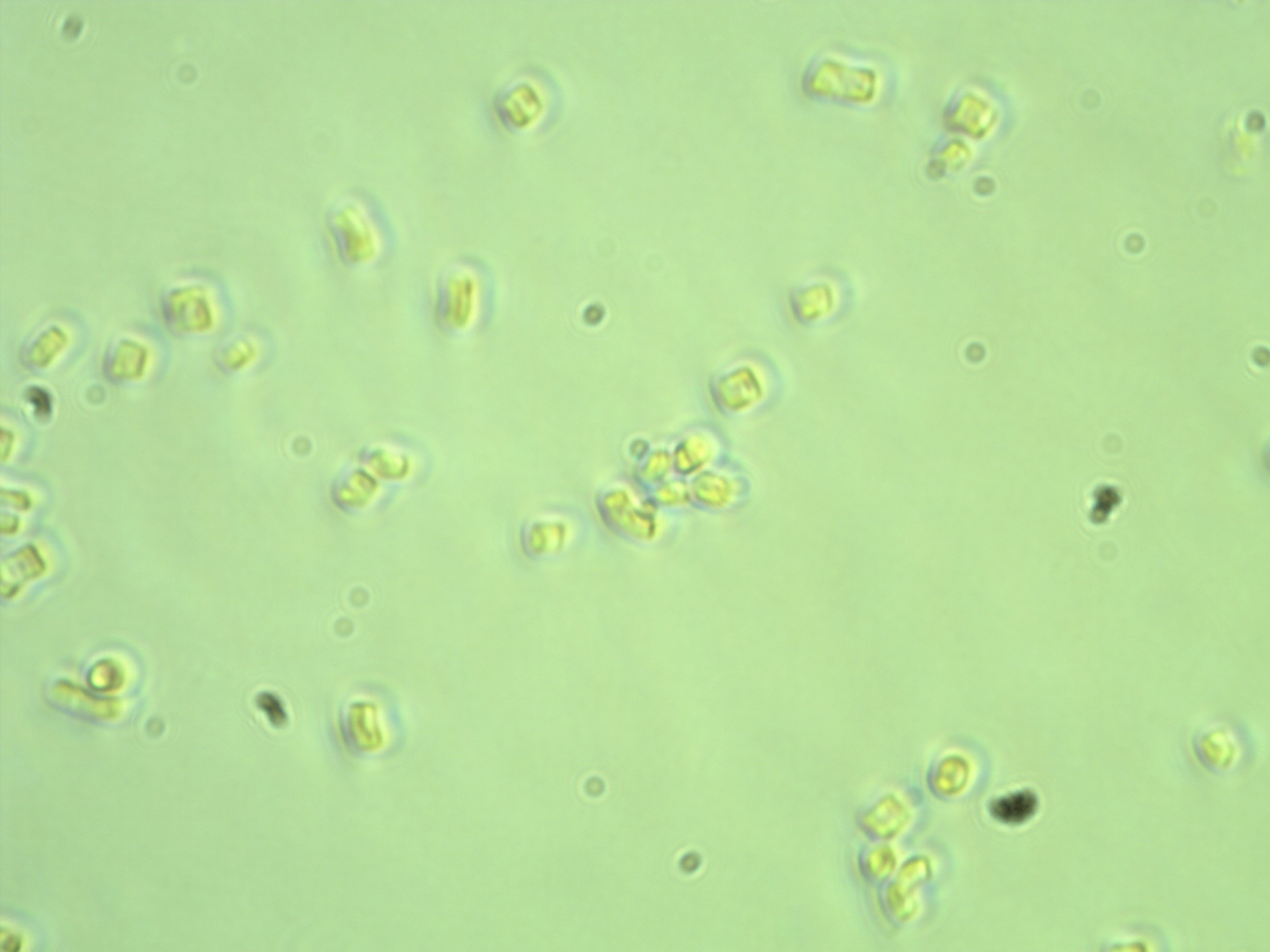 Fragilariopsis cylindrus, a polar pennate diatom. This particular culture has been lab-cultured for a long time and so the cells are much smaller than some of my other cultures. This picture was taken at a 40x, rather than 20x magnification on the microscope.