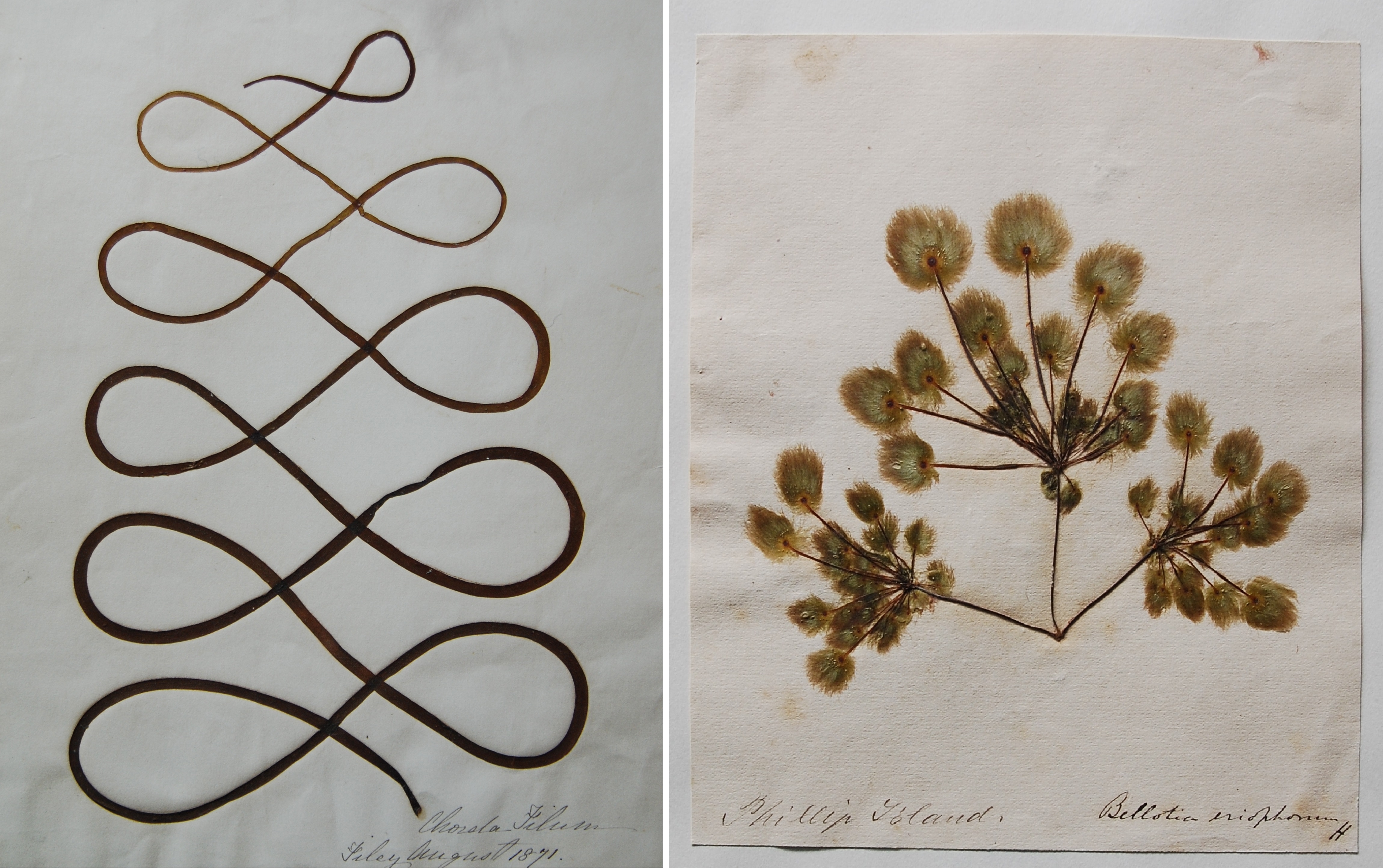 Two seaweed specimens preserved by Gatty: Chorda filum (left) and Bellotia eriophorum (right). Gatty’s personal herbarium is now part of the University of St. Andrews Herbarium in Scotland. Images from http://naturalsciencecollections.wordpress.com/2013/08/27/margaret-gattys-algal-herbarium-in-st-andrews/.