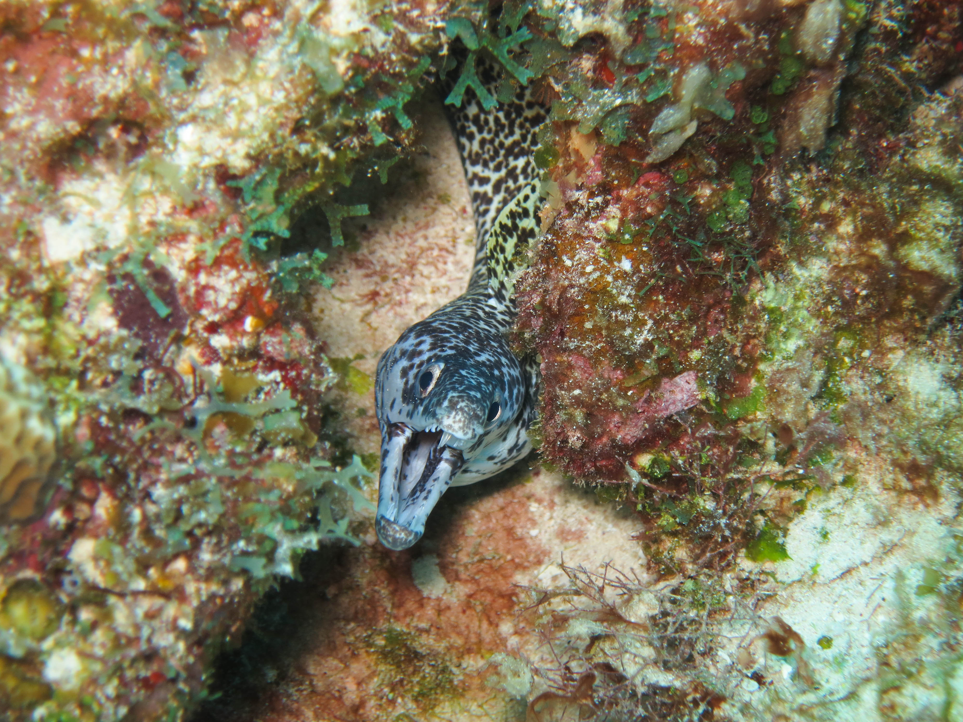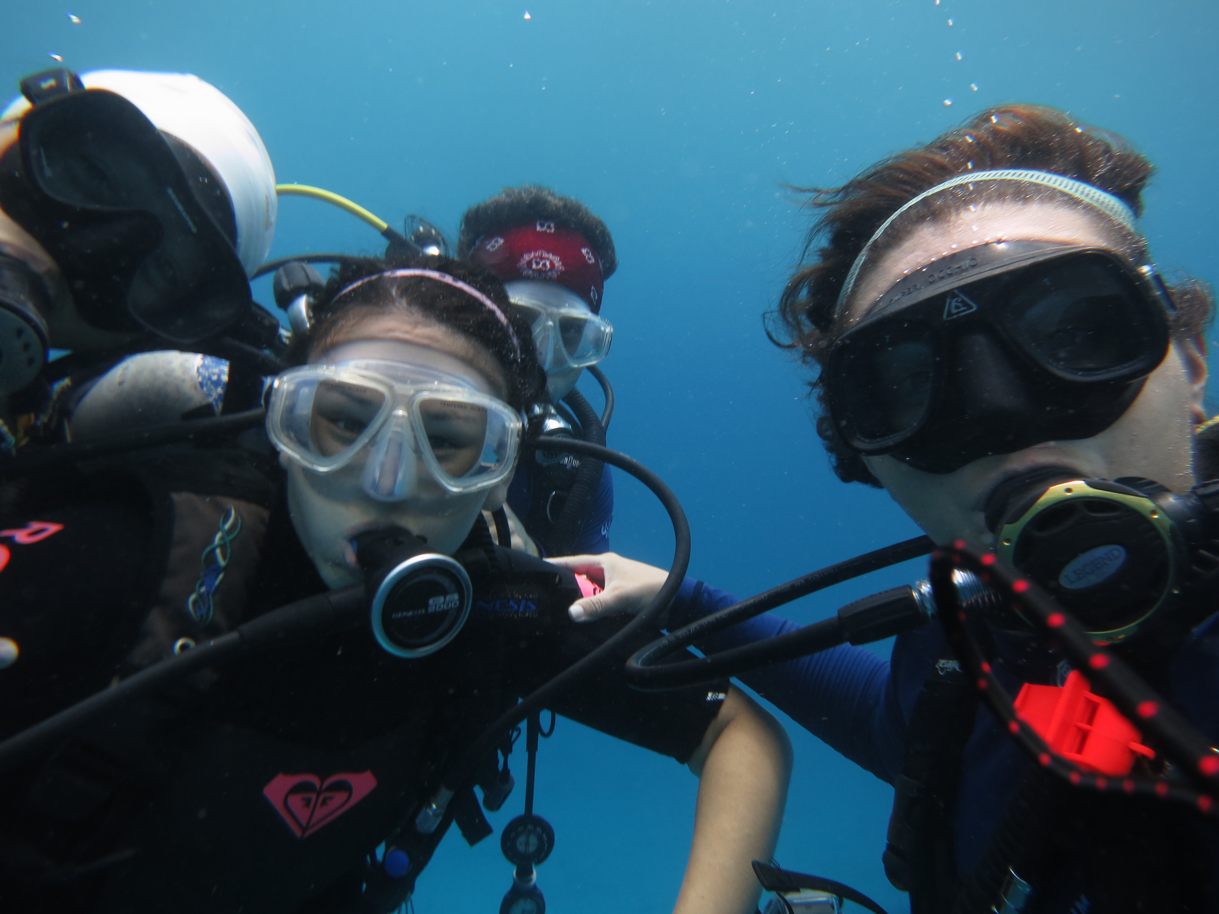 Unfortunately the GoPros have been giving us a hard time so we have gotten a lot of great videos of our confused faces staring into the screen! (Stay tuned for a few YouTube videos of our best GoPro science fails) We have to repeat all of this six times on each reef without getting lost underwater or running out of air! We have gotten it down to a pretty smooth system, though (aside from our technically difficulties), so I usually have time to take pictures of other awesome sea life like this spotted moray eel. We also love to take goofy pictures during our safety stops, especially dive selfies.