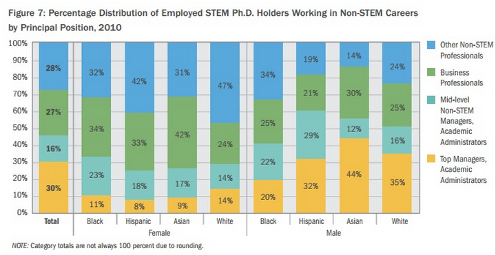 5. Women may study in STEM but they don’t stay. At least not at the rate men do. Even race doesn’t seem to play as much of a factor as gender does when it comes to who moves up the ladder in the ivory tower. Men leaving STEM professions tend to find themselves in jobs denoted as ‘Top Managers, Academic Administrators,’ indicating a promotion. Women, on the other hand, overwhelmingly end up in the category of ‘Business Professionals’ or ‘Other Non-STEM professionals.’ After years of study in their discipline, they walk away. I think we can assume something in the STEM environment proves poisonous to women’s retention rates.