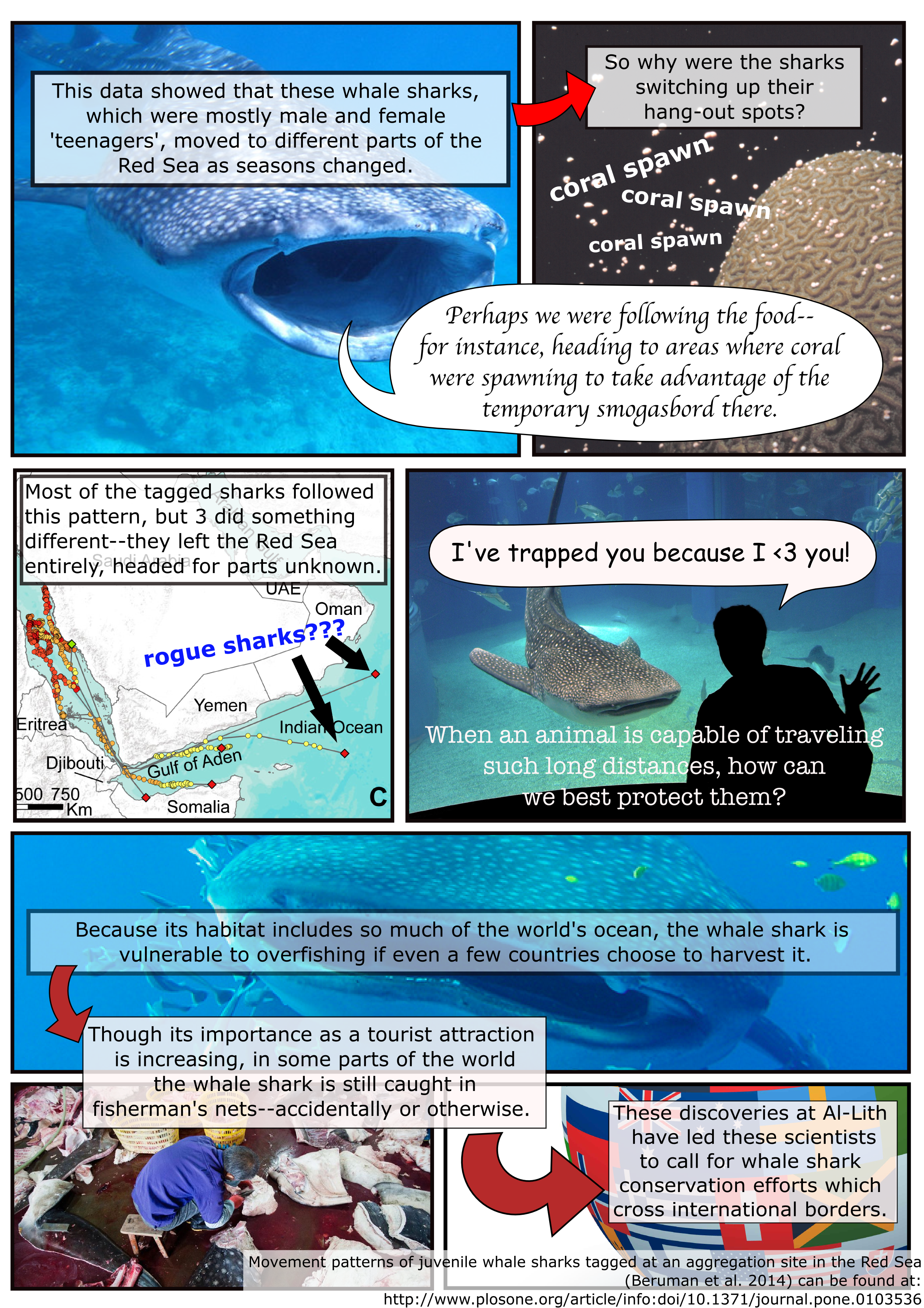 What’s not to love? And to top it all off, this week I bring you the results of a recent whale shark study presented in a heavily pictoral format (pictures! science! speech bubbles!). The journal article itself is open access, meaning anyone can go peruse it themselves fo’ free: find it here at PLOS ONE.