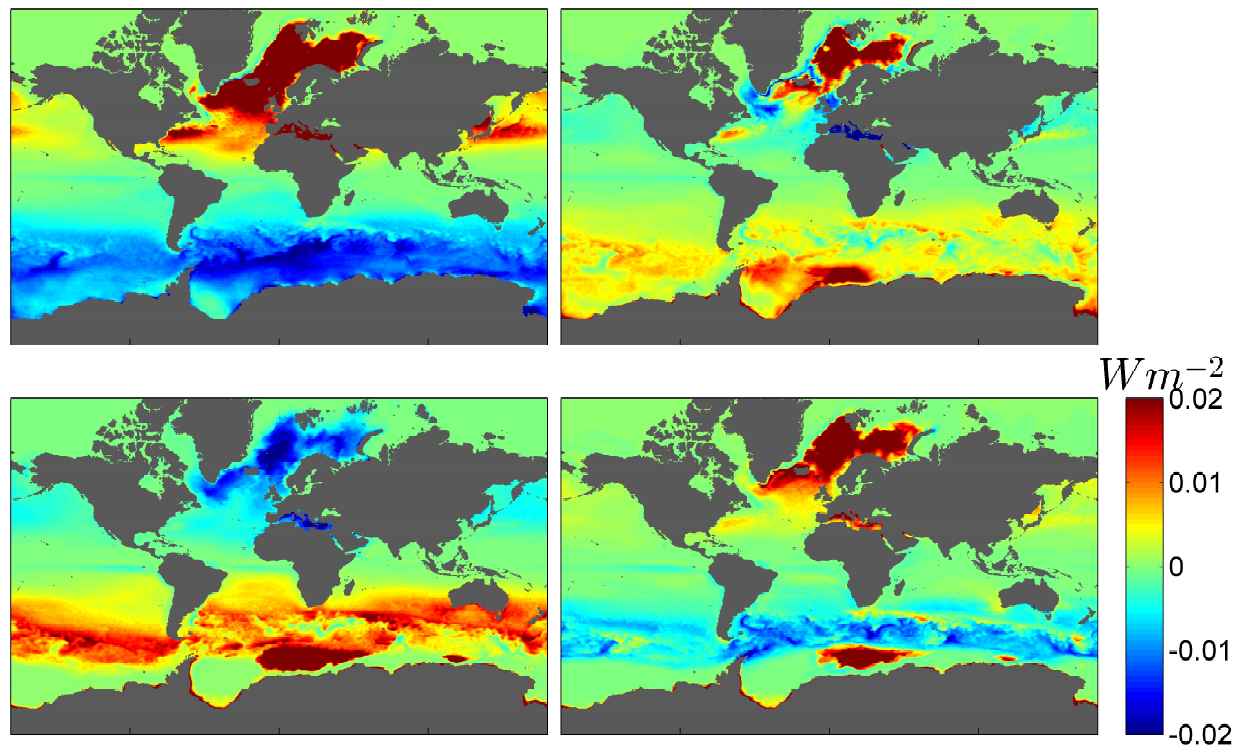 To do this, she uses the General Circulation Model developed by MIT, which provides a time series of various oceanic properties at a fairly high temporal resolution (every 3 days for over 16 years). This data, and a lot of math, can offer some insight into the oceanic energy cycle, and where we expect the most influence from buoyancy fluxes and surface winds. You can check out some of her results in the picture to the right – a seasonal breakdown of the available potential energy all over the world. A higher value (red) here represents generation of heavy, sinking water, and lower (blue) is the generation of lighter, floating water.
