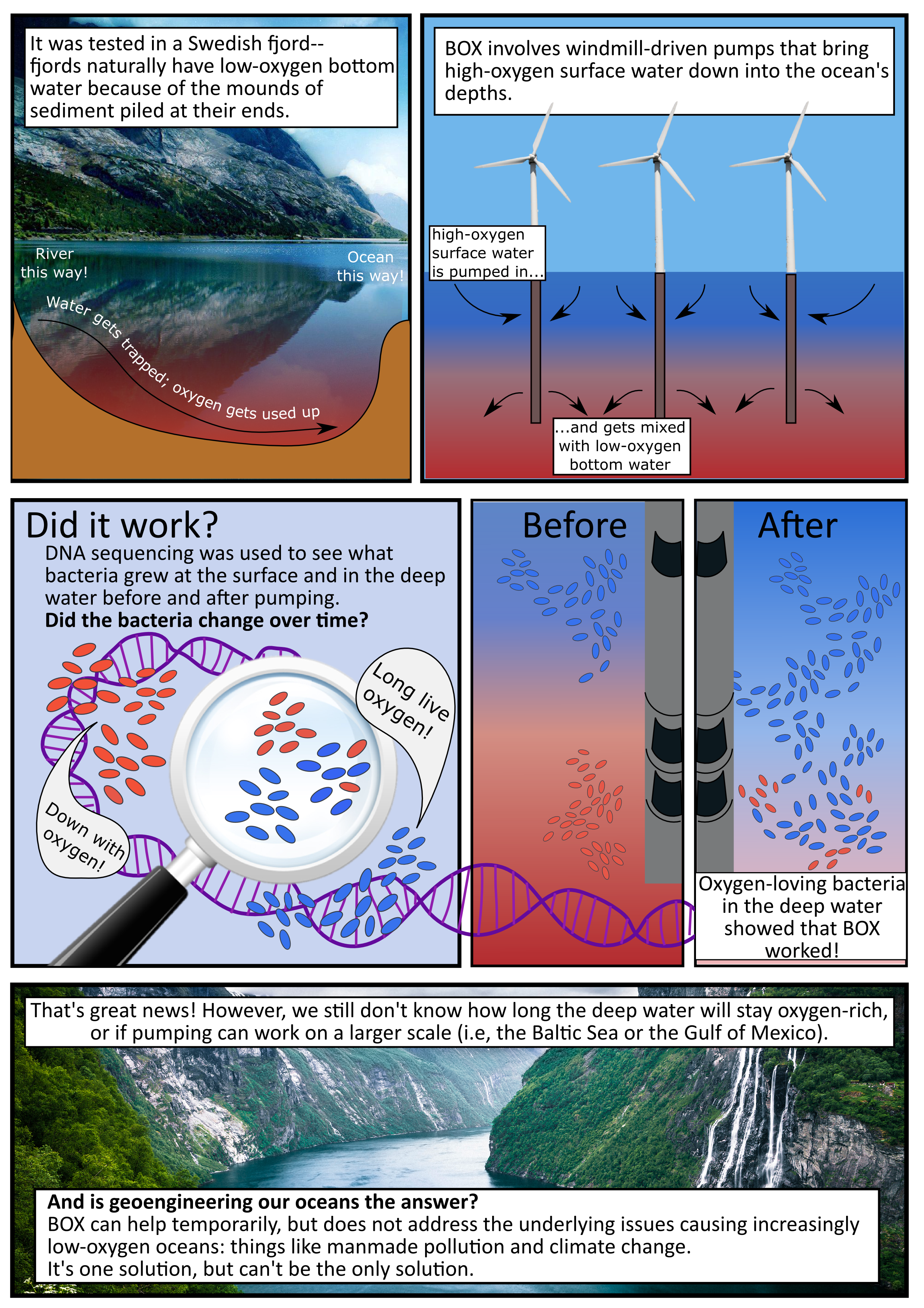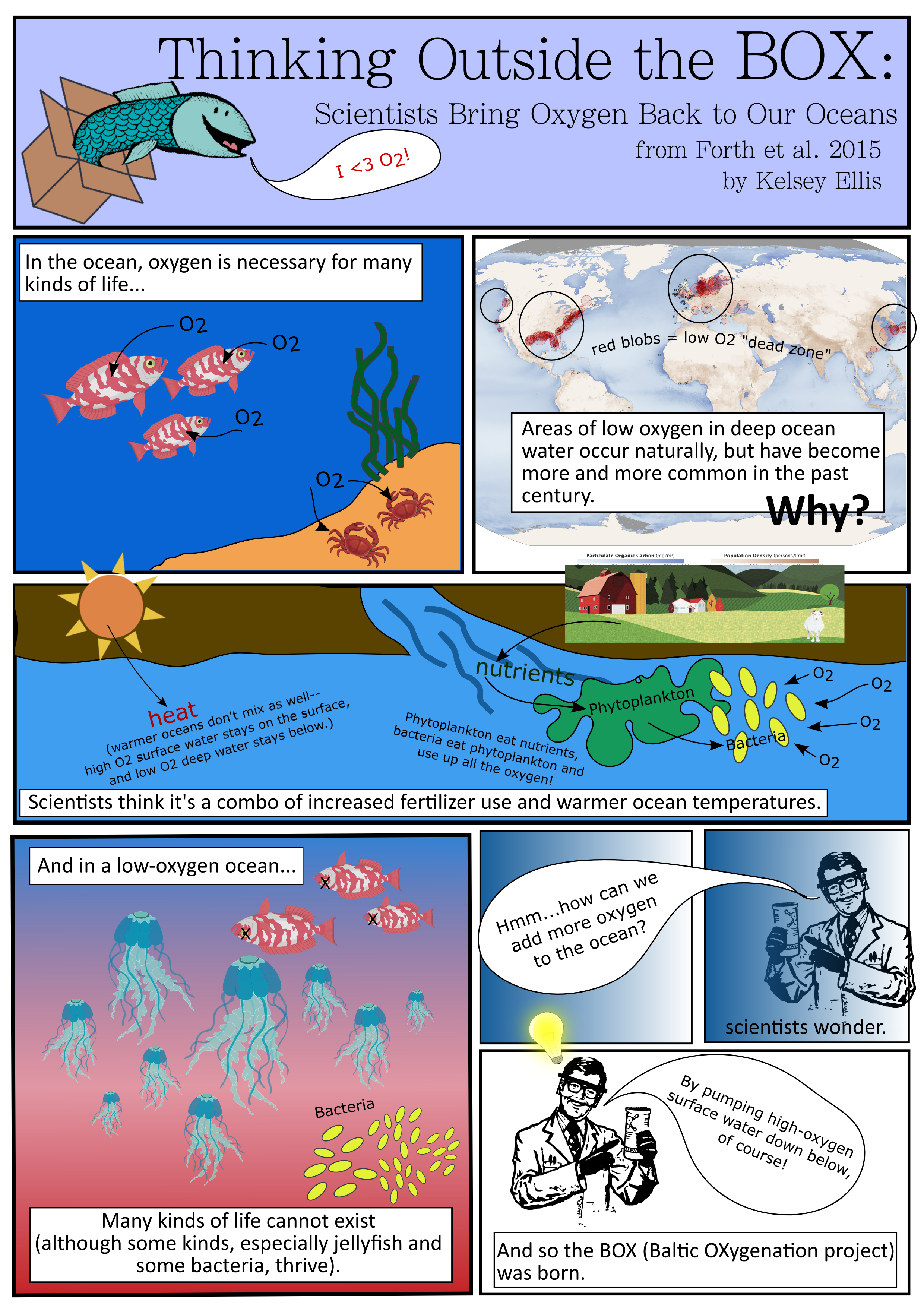 Oxygen is (as you’re all probably aware) important to life on land–but it’s extremely important to marine life as well. Most sea creatures, such as fish, “breathe” water and extract oxygen using their gills. Without oxygenated seawater, the vast majority of life in our oceans, other than phytoplankton and some specially adapted bacteria, would cease to exist. Areas of low oxygen in the oceans have been increasing in size and frequency, which is why one group of scientists (link to paper) has been working on a geoengineering project that might be able to increase marine oxygen levels–see my attempt at a comic below for more info!