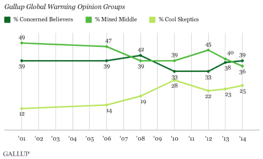 In taking a second look at the polling data Gallup provides above, I think there is no coincidence in the fact that the percentage of people concerned about global warming dipped dramatically in 2010 when both the rise of Super PACs and the Tea Party happened in that same year.