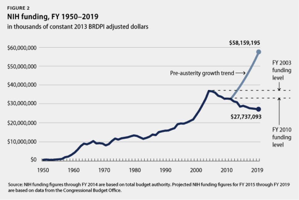 The NIH budget peaked in 2003 and has been dwindling ever since. When you compare this to the budget of the US department of defense, the exact opposite is happening. There is money in the federal government and federal spending continues to increase, but it is not going to science research like it used to be.