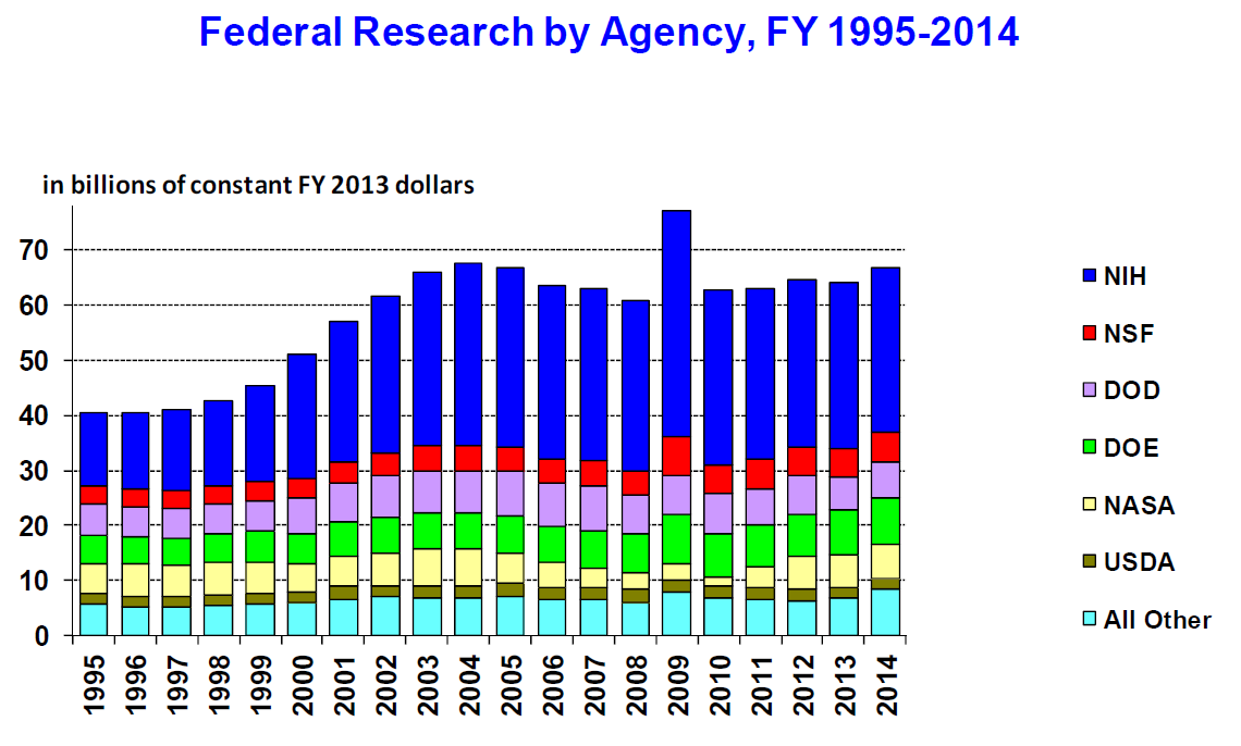Yikes. I guess the funding situation could be worse? Key: NIH = National Institutes of Health; NSF = National Science Foundation; DOD = Department of Defense; DOE = Department of Energy; NASA = National Aeronautics and Space Administration; USDA = US Department of Agriculture. Image from here.