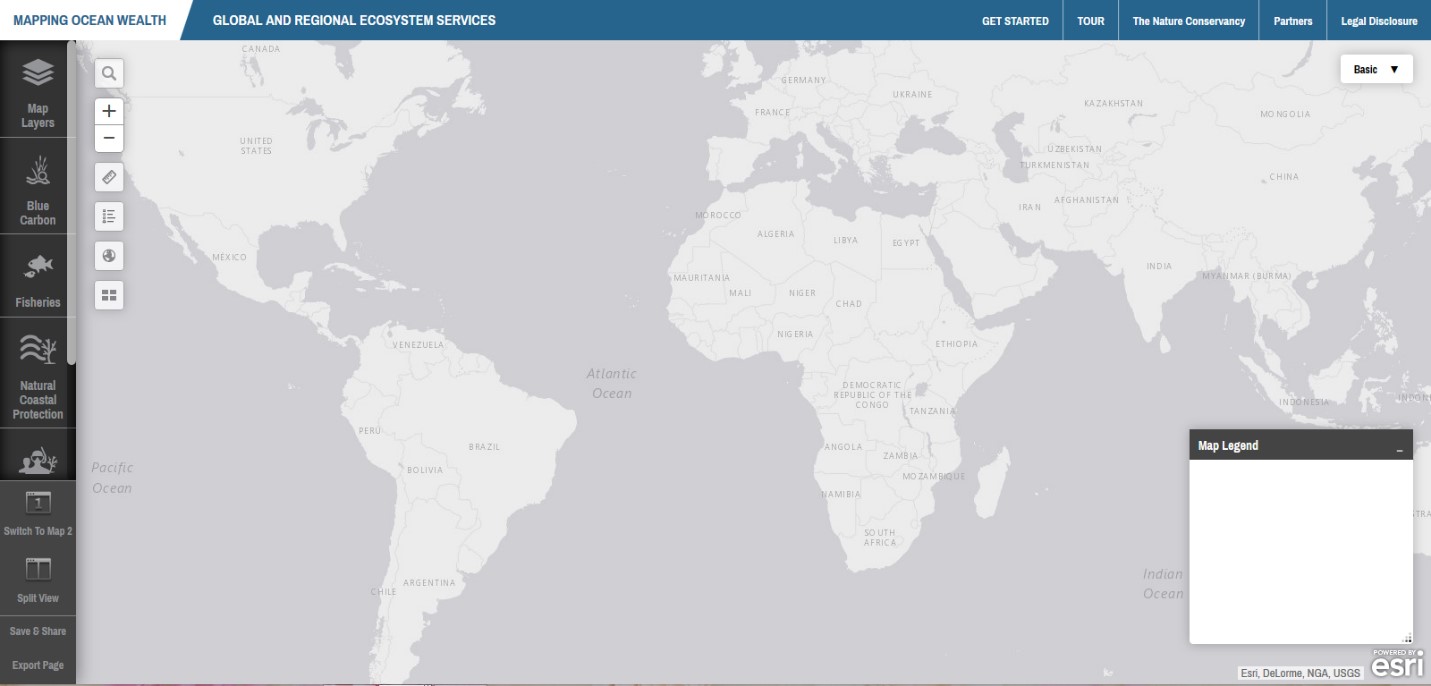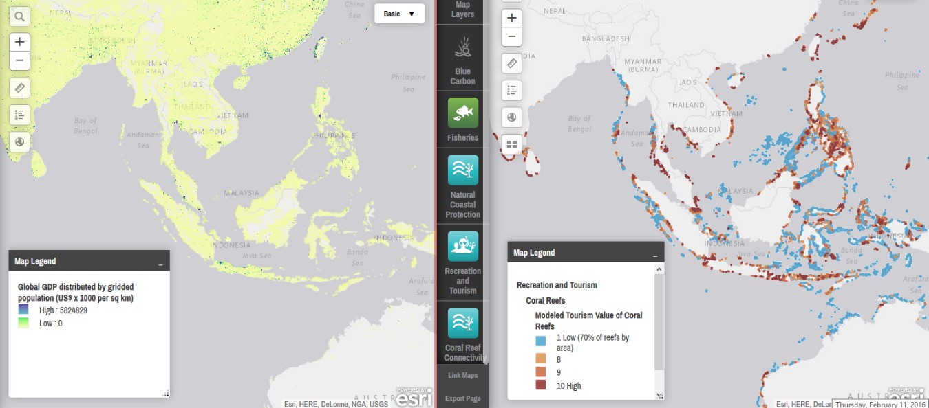 Mapping Ocean Wealth is potentially most interesting for its ability to visualize human and natural parameters. By splitting the screen, one can view two maps at once, enabling more sophisticated exploration. (It’s also possible to add multiple layers to a single map, but because the legend colors are often similar, it can be difficult to make sense of a multi-layer map.) Below is a screenshot of national GDP on the left alongside a map of tourism value from coral reefs on the right. High tourism potential doesn’t seem to be correlated with increased GDP, and that realization could prompt a manager to consider why that is and whether it’s a problem.