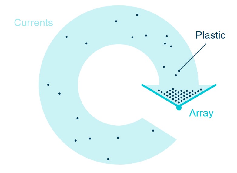 A visualization of the screen apparatus in relation to the swirling current. Image from https://www.theoceancleanup.com/technology/